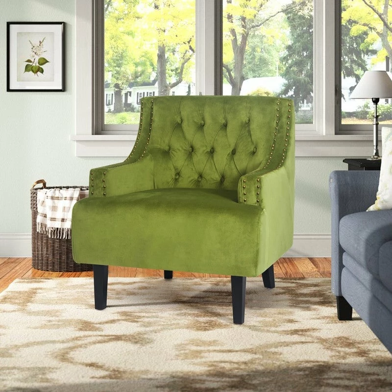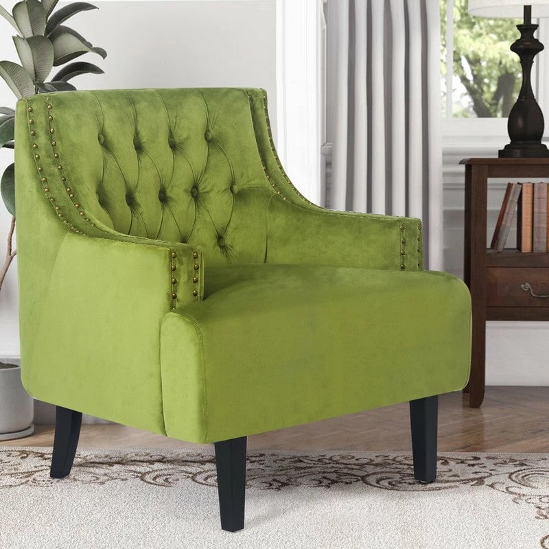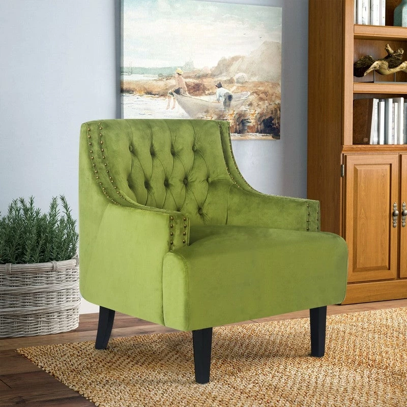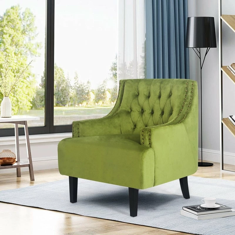 BUTTON TUFTED: Velvet upholstery envelops this chair for a textured and inviting look, while sleek nailhead trim and button tufted details round out the design with a tailored touch.