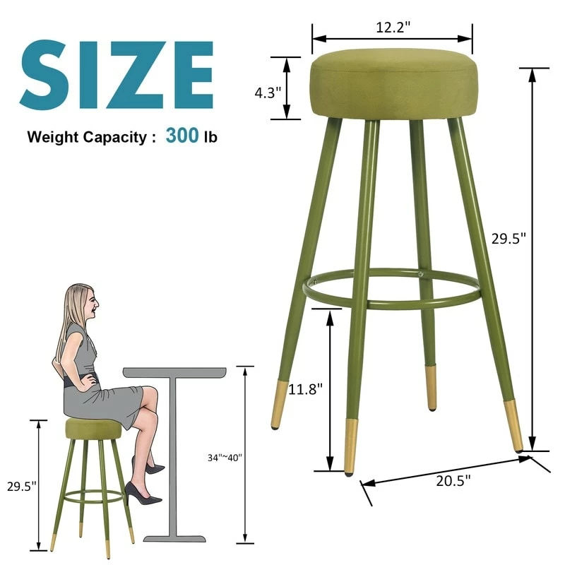 IDEAL SIZE: Seat height: 29.5 inch, the max weight capacity is 300lbs. Ideal for bars, home, offices, cafés, balcony, coffee shop, pubs and kitchen; Bottom anti-slip design keep them from sliding and scratching your floors.