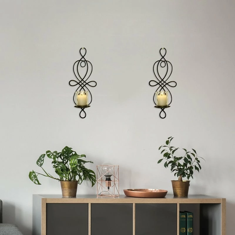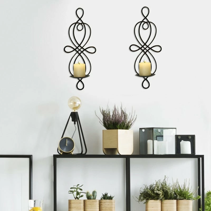 - Surround your indoor relaxation space with a calming, spa-like ambiance by hanging these candle holders. These wall sconces show off a striking scroll work design for visual charm, and they hold votive and pillar candles to bring soft illumination as you relax at night. The black, iron construction promises longevity.