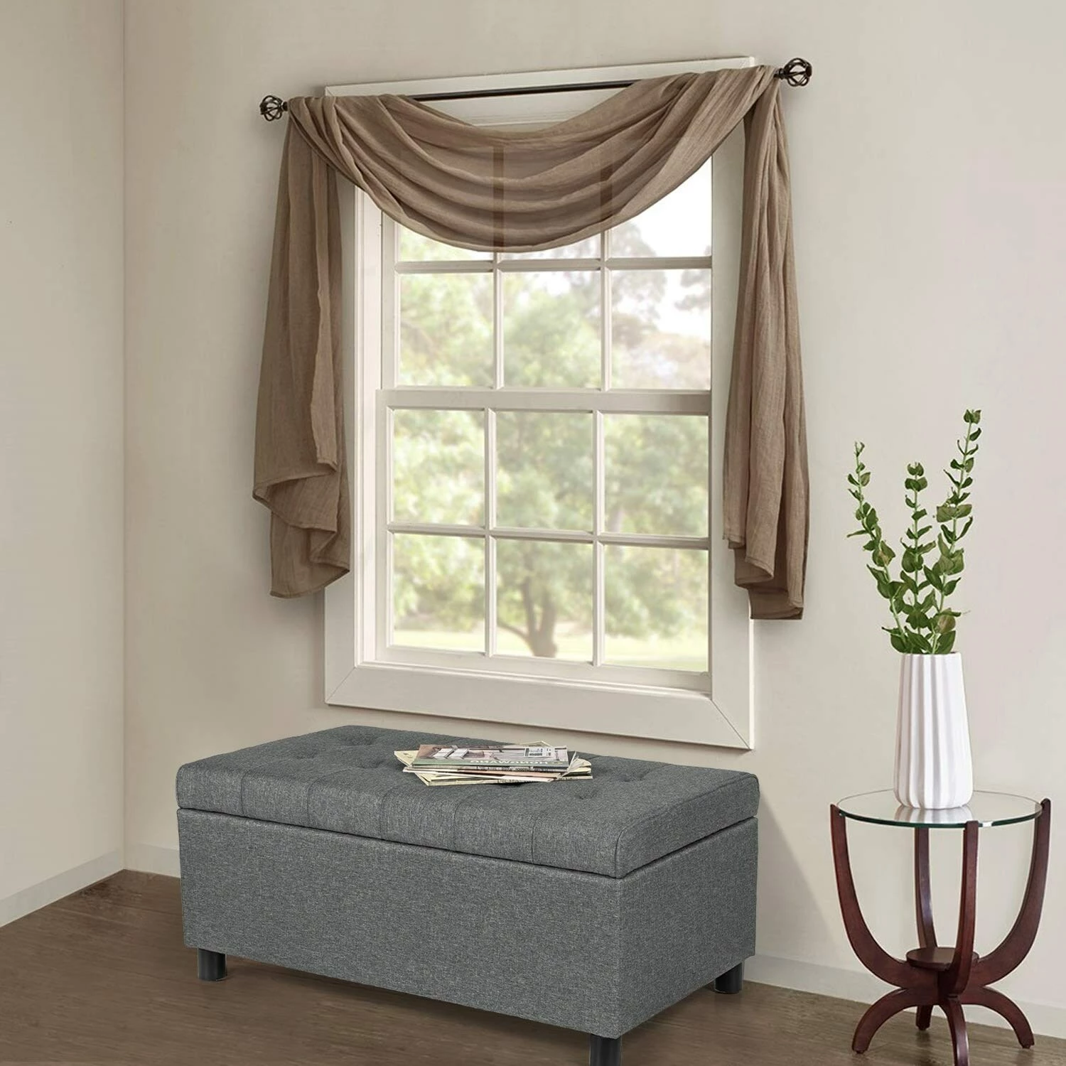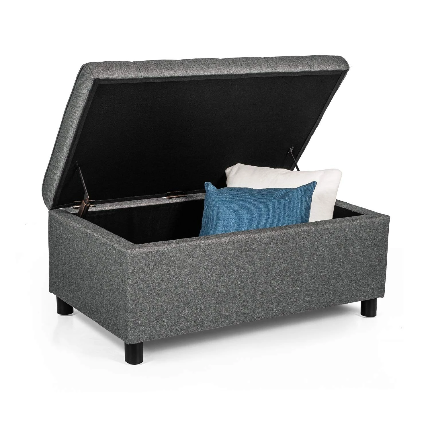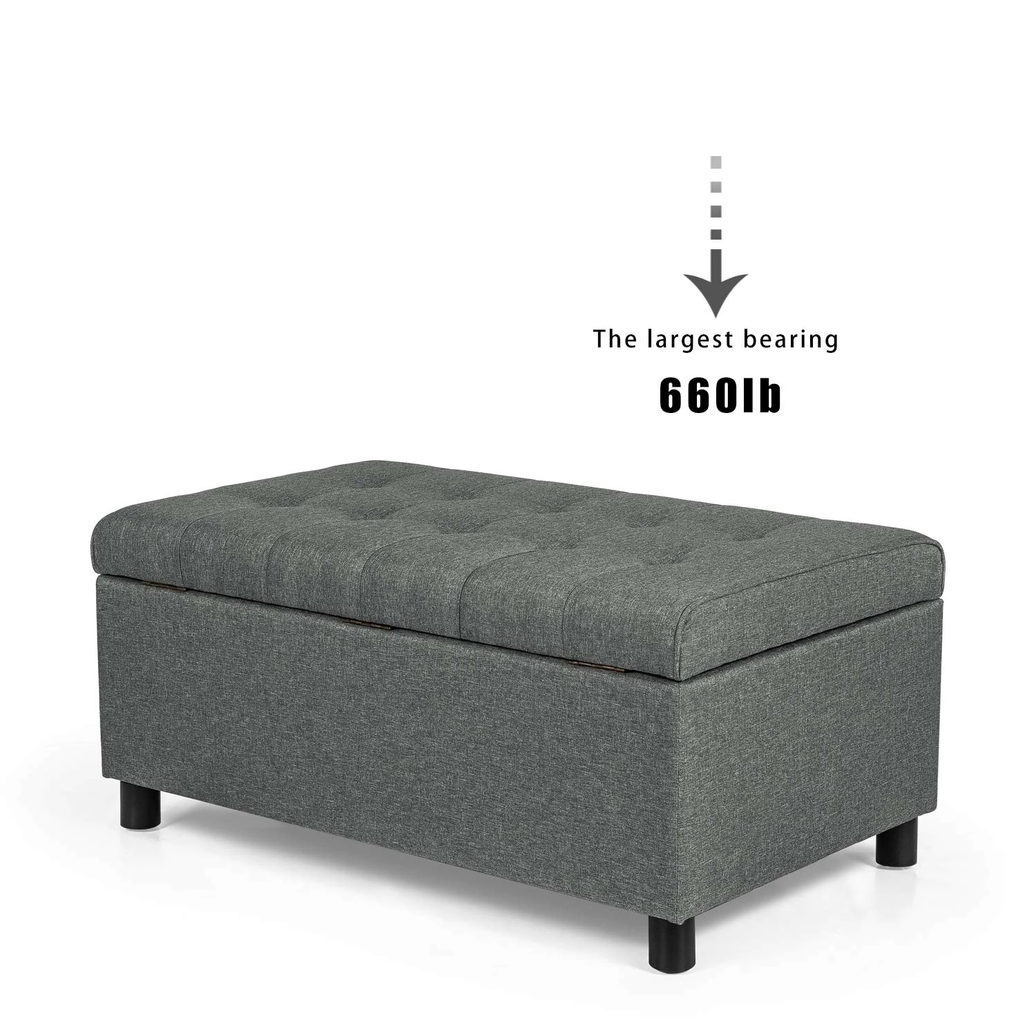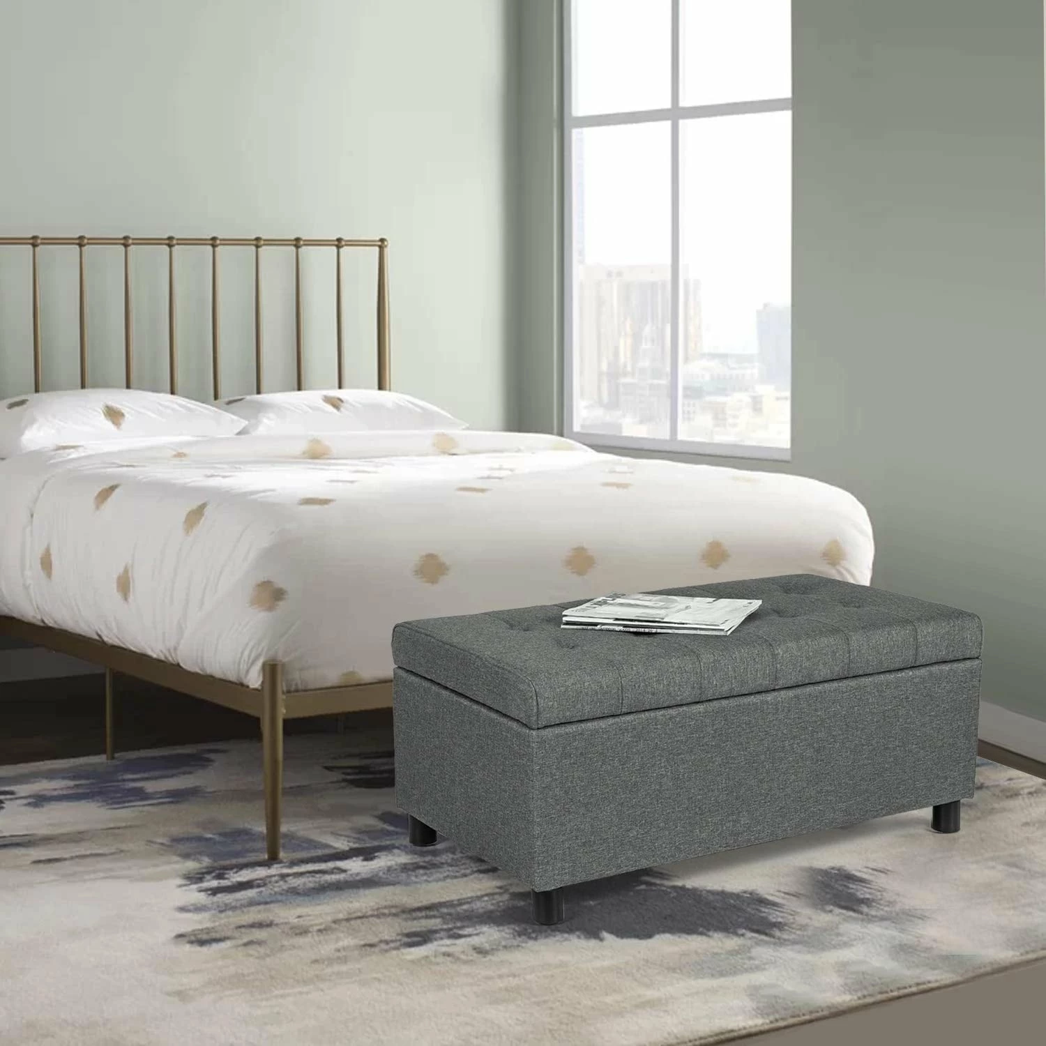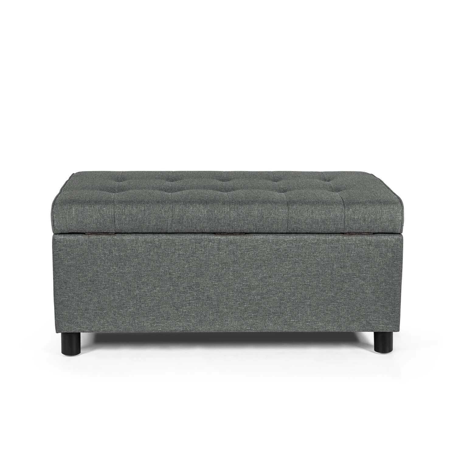 Comfort, function, and style meet in this rectangular storage ottoman. The ottoman features a sturdy corner-block frame with a hinged, padded lid that stays open for safe access to the internal storage space. The ottoman is upholstered in plush, grey fabric with tufted detailing, adding extra charm to this practical ottoman bench.