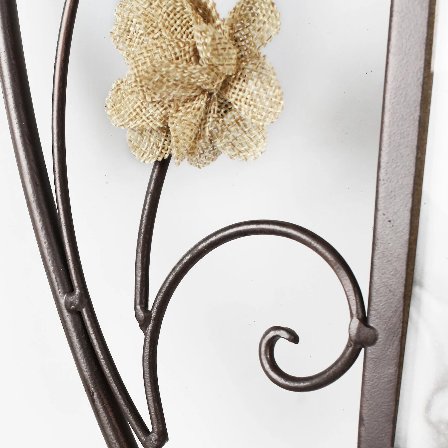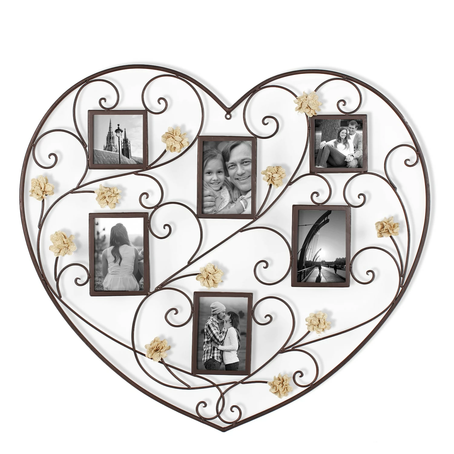 Enshrine your favorite memories in this decorative heart-shaped collage frame from Adeco. Six openings in two different sizes create a varied design on your wall, while the bronze-toned iron material gives long-lasting resilience to the spiraling scrolls and vines. Gathered burlap fabric creates miniature flowers that add earthy appeal to your treasured photo collection.