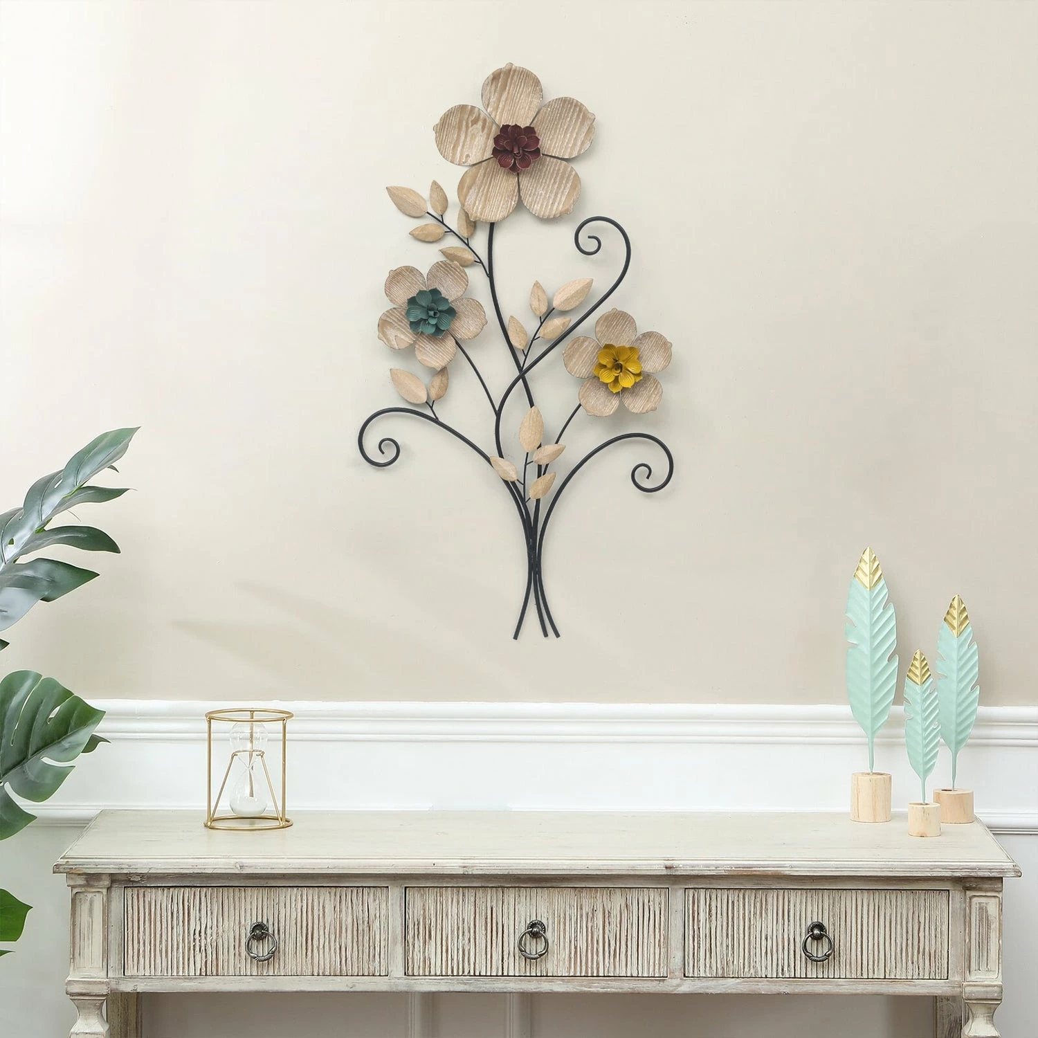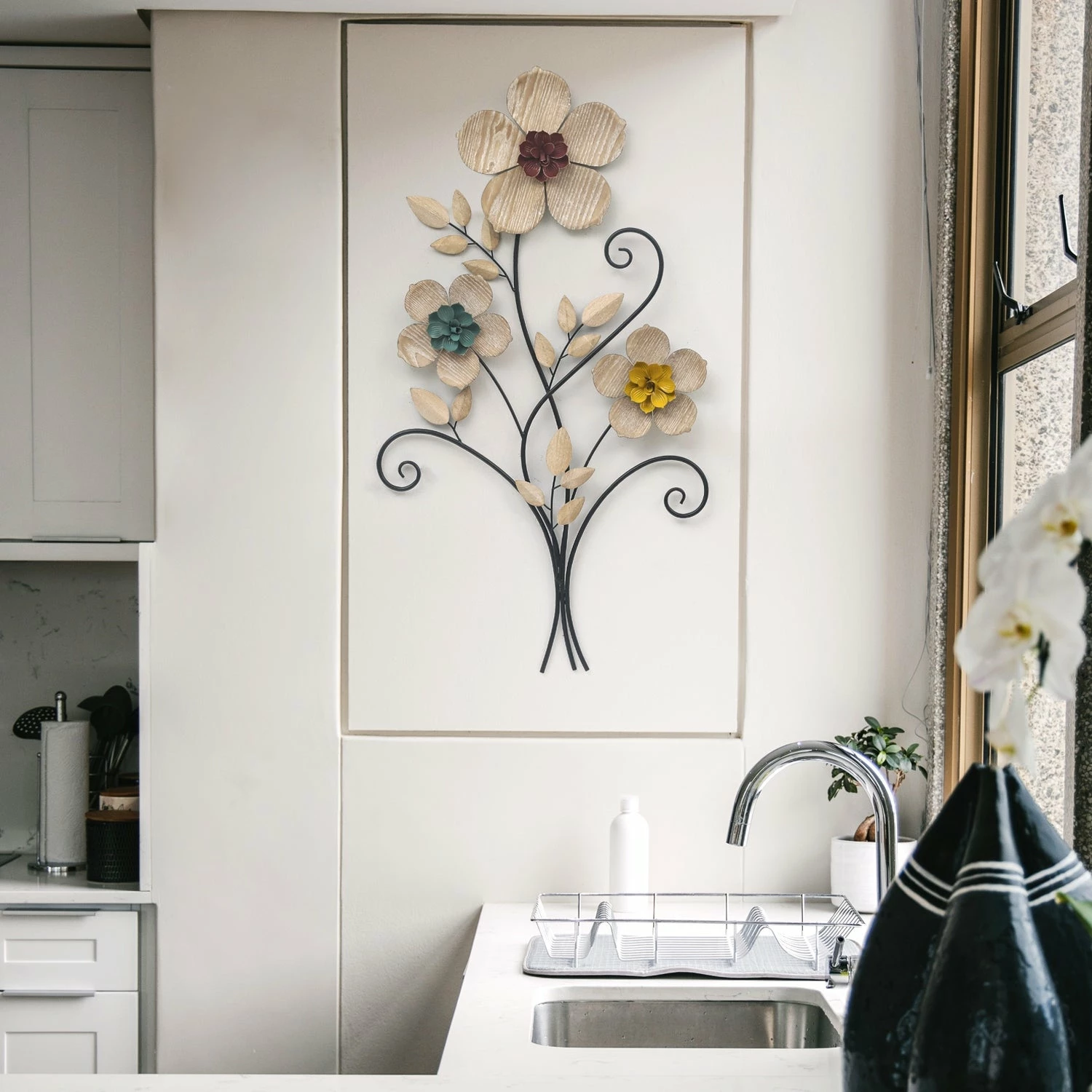 - γQuality Material with Exquisite Craftsmanshipγ The metal wall art flowers are handcrafted with quality metal, strong and sturdy,not easy to bent, built to last.Each flower features a unique natural wood texture pattern and colorful stamens,extremely beautiful,elegant and rustic.The natural color scheme will create a comfortable and warm atmosphere around your home.