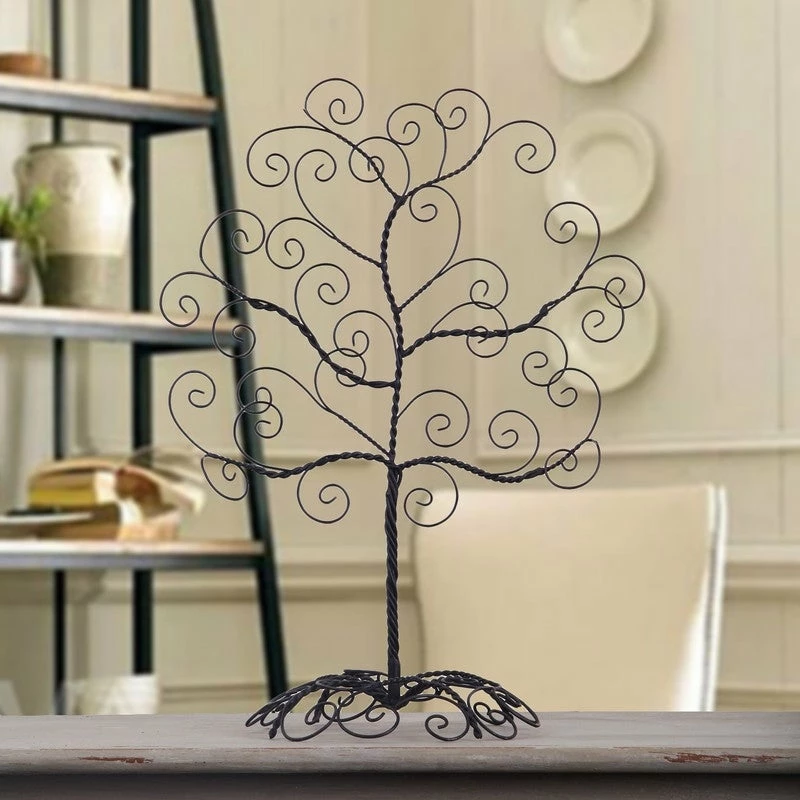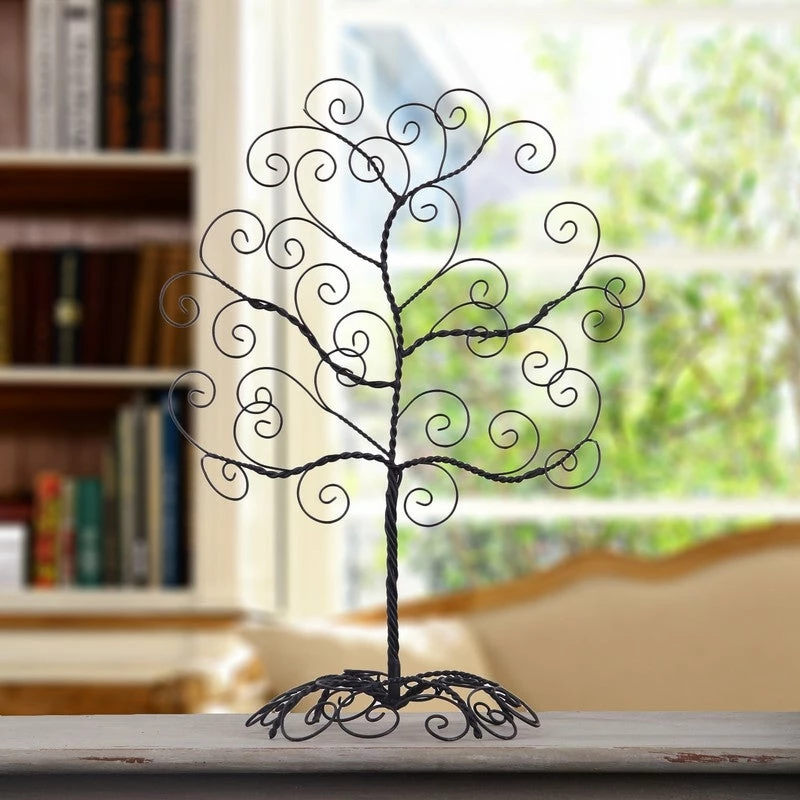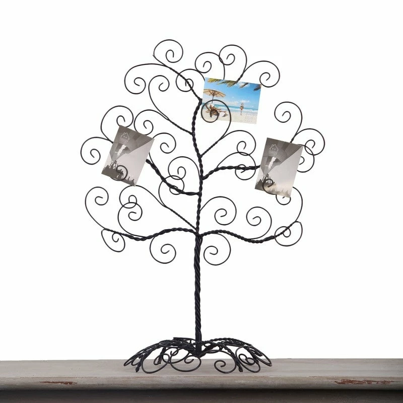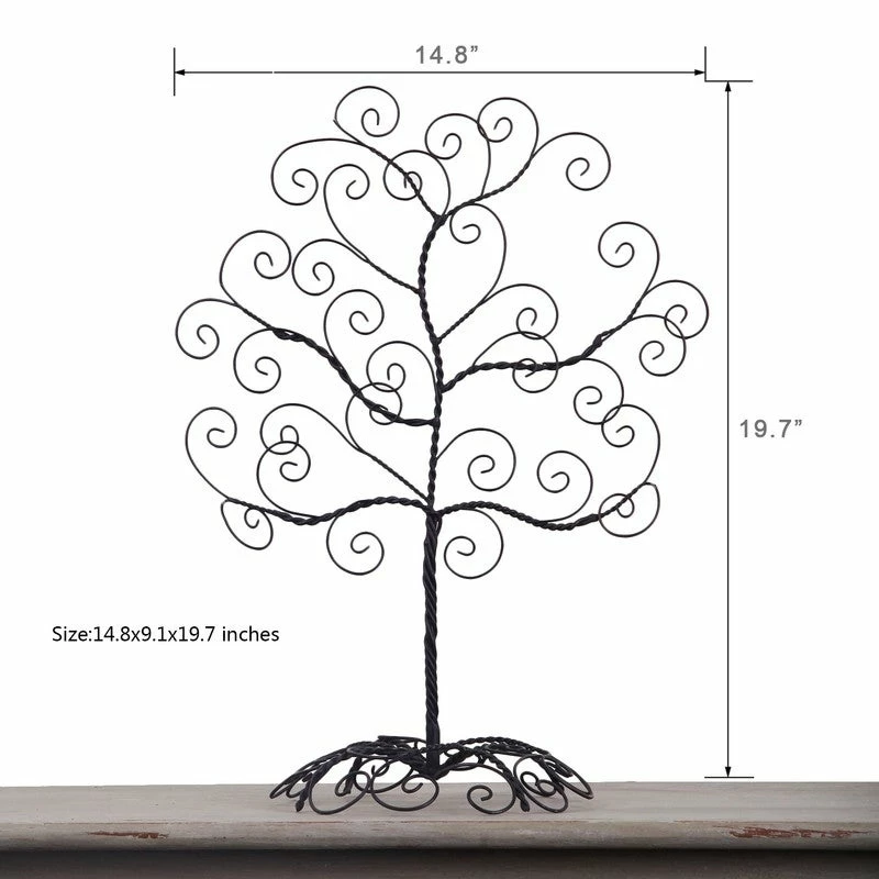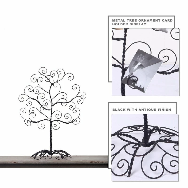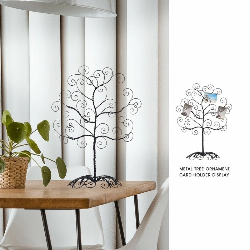 STYLISH DESIGN: More than just a photo display stand. With 32 Scrolls and 5 Branches, the display tree stand can hold up to 30 pictures or ornaments, floating lightly above a twisted and scrolled base. Also work very well as small jewelries organizer.MATERIAL: Wrought and Cast Iron Frame with Matt Finish. Great addition to display of your unique collection. Festive and eye-catching stands to help accentuate and showcase your hanging collectibles.DIMENSIONS: 14.8in*9.1in*19.7in. This playful tabletop picture stand and photo holder is a great addition to display of your unique collection.GOOD-LOOKING BASE: The unique design of the scrolls of the base increases the ornamental but sturdy and stable enough. Great for events: display photos in a unique fashion at milestone occasions like weddings, birthdays, showers and more – or use it as fun money tree.EASY ASSEMBLY: The tree picture frame holder comes with all parts needed. Just need a few seconds to assemble and then put your treasured pictures or money ornament on it.