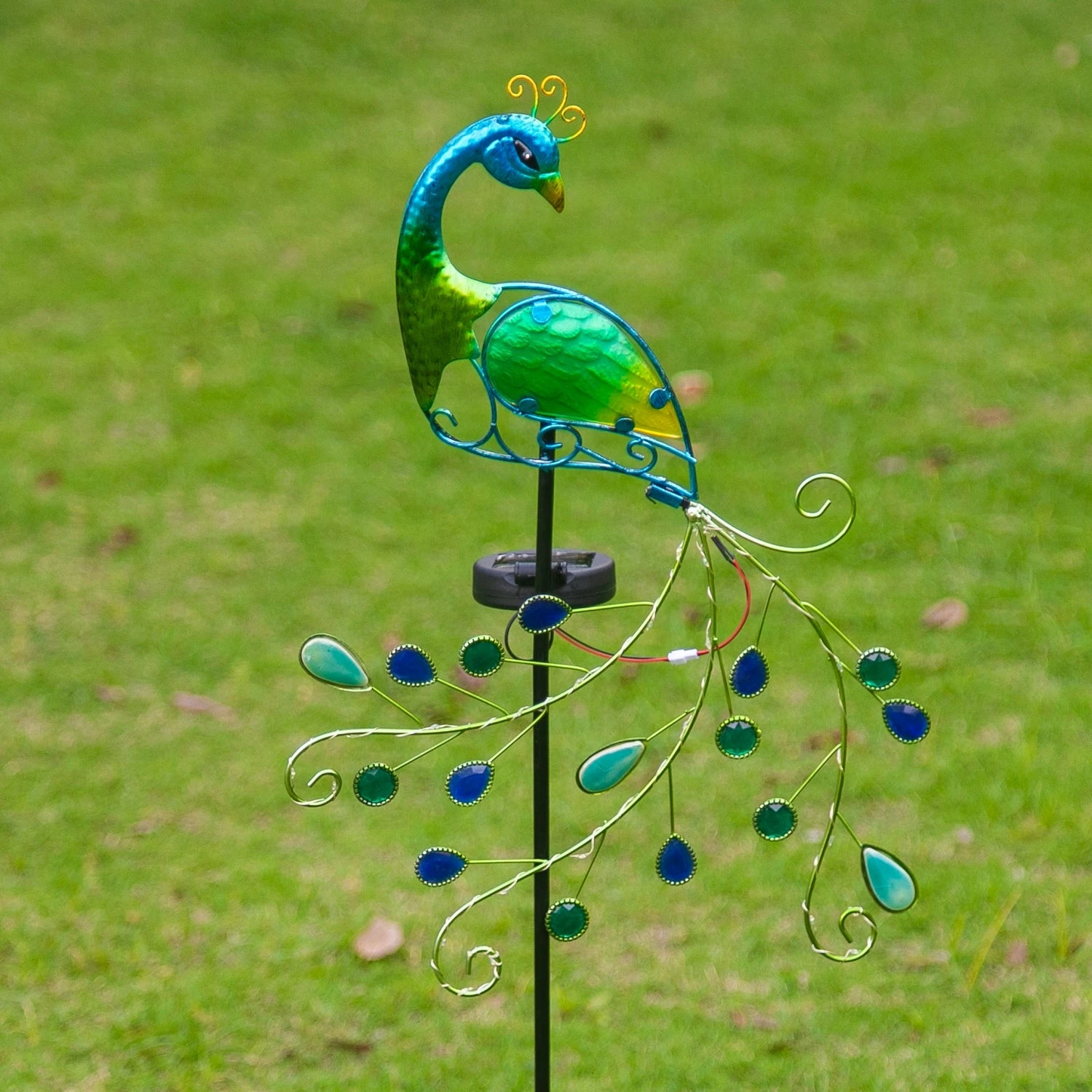 - Unique Design: This solar powered garden light is designed with glass globe and the peacock tail is embellished with faceted acrylic crystals, with a solid iron peacock shell. Built in solar panel without any wires, it can convert sunlight into electricity during the day, and light up beautiful lights at night automatically.