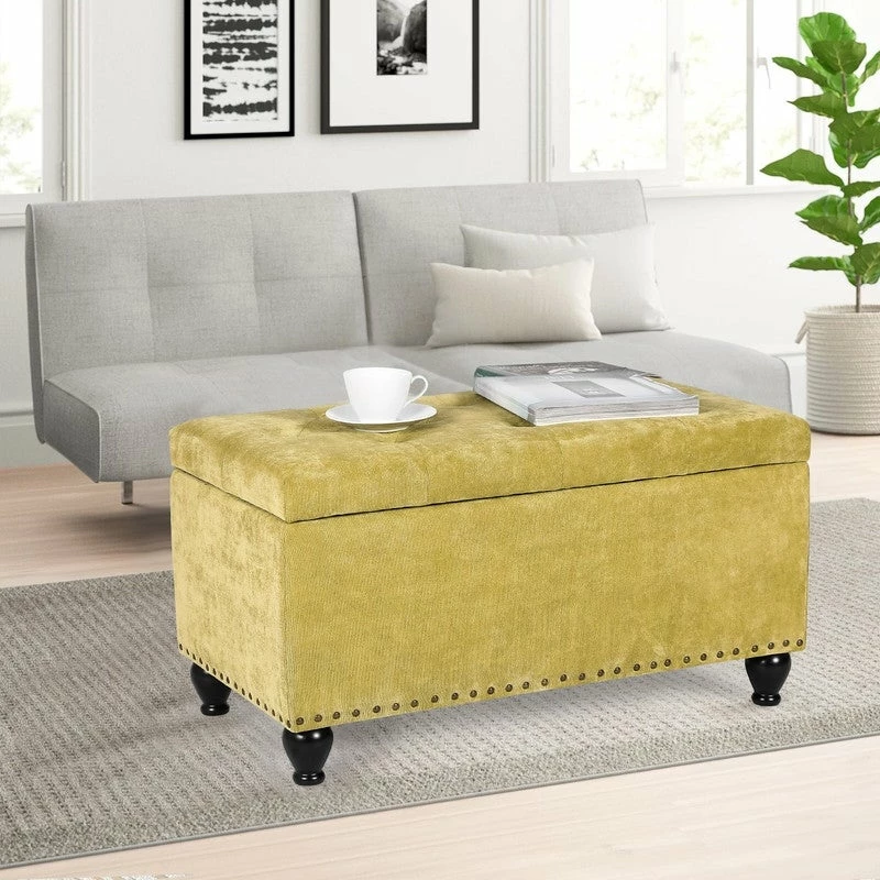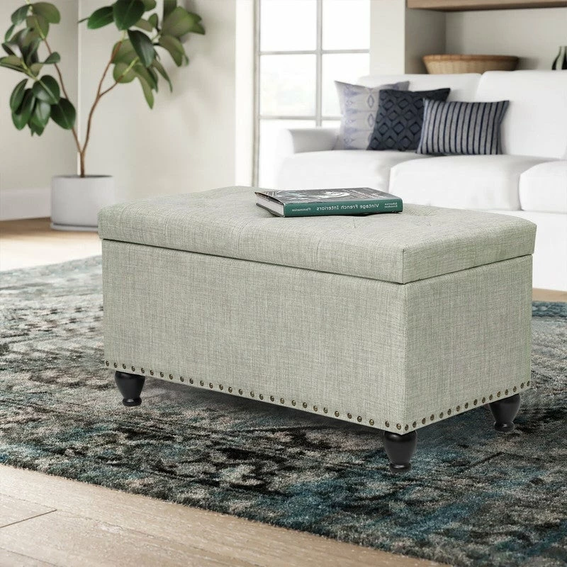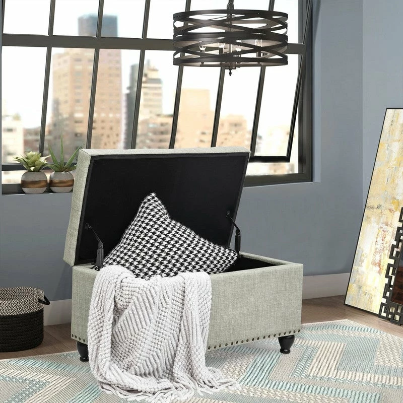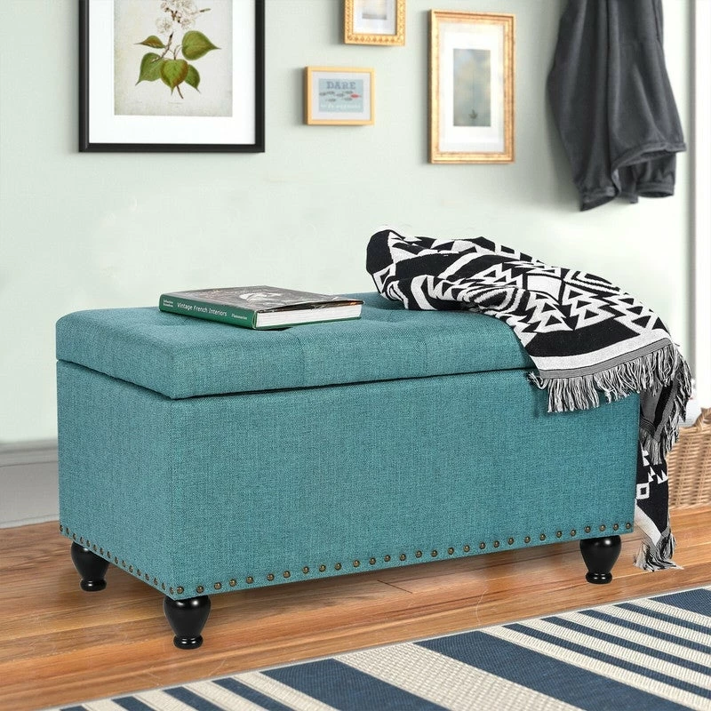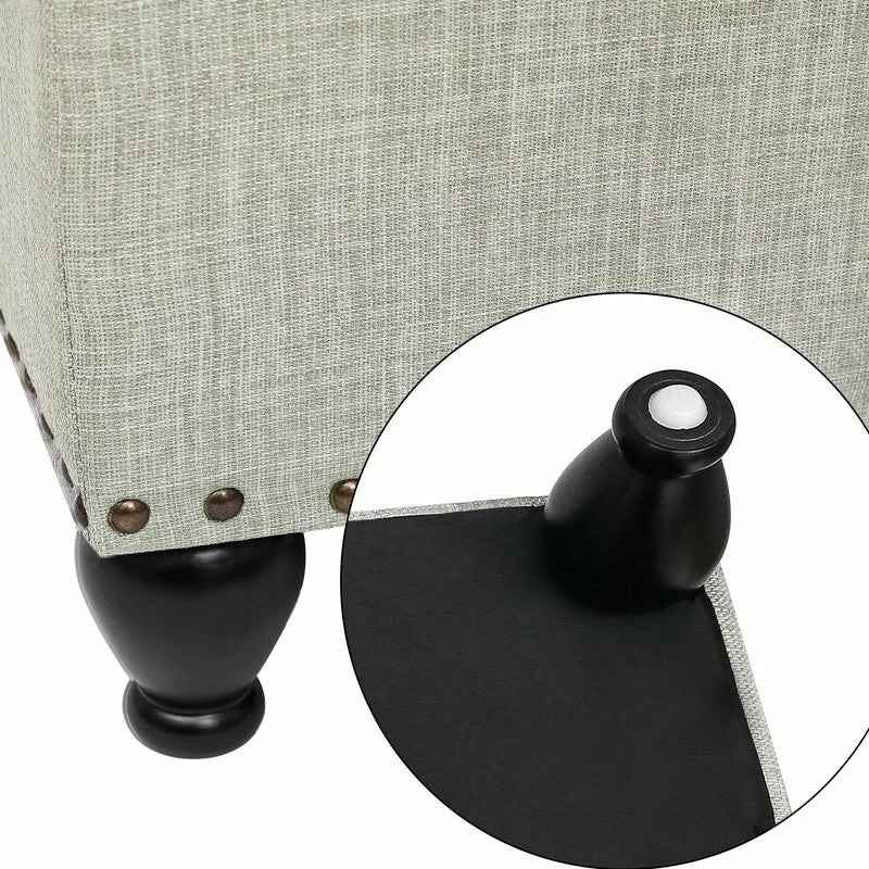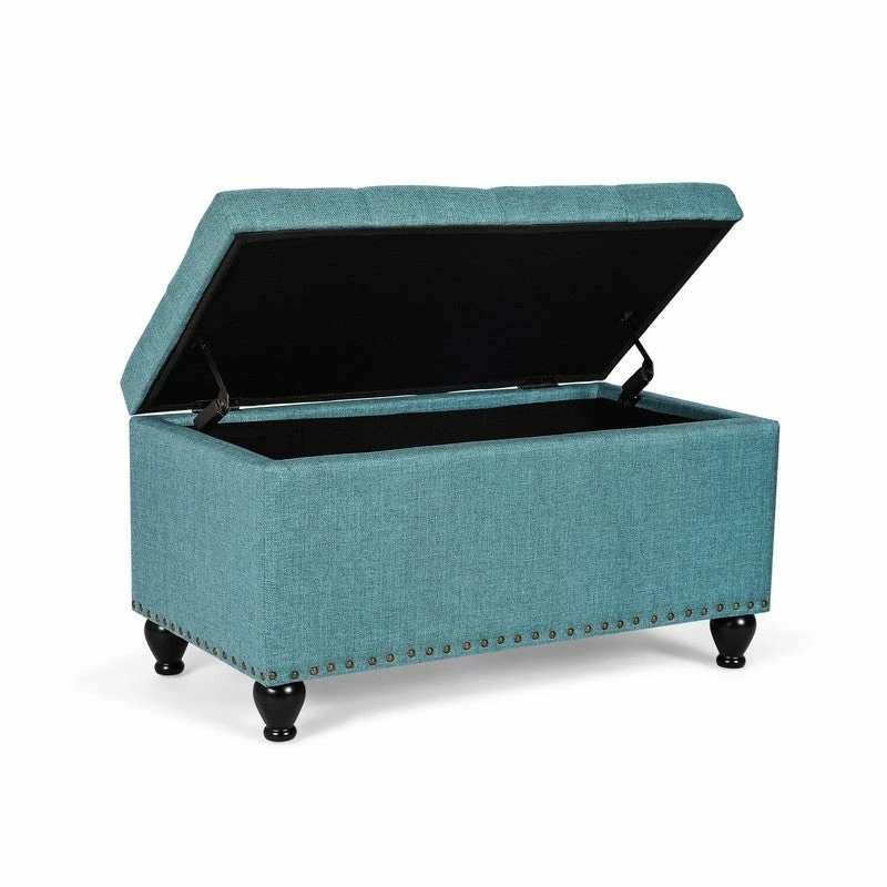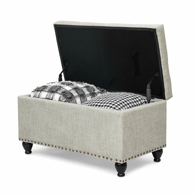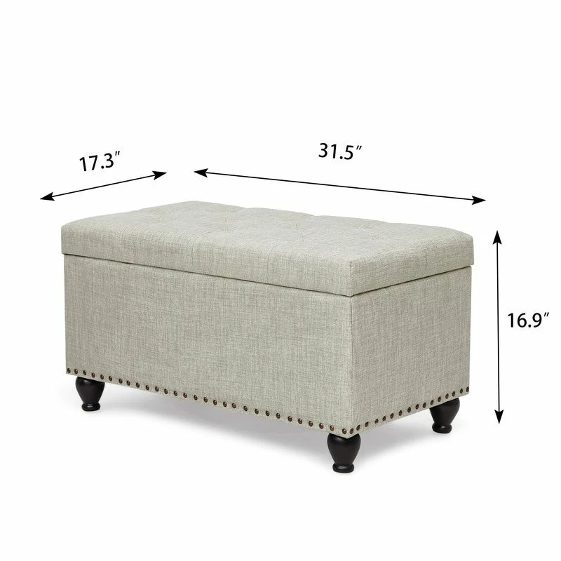 Elegant Design: Features button-tufted surface, linen-fabric upholstery, nail-head trim along the edge for eye-catching elegance.Easy to install: The only thing you need to do is to attach the legs, then enjoy the comfortable seat.Multi-functional use: For storing books, blankets, off-season clothes, toys or other sundries in your bedroom, living room, hallway or guest-room, etc.Exquisite craftsmanship: Well constructed with wooden frame which ensures long Last use.Safety & Reliable: Item weight: 21.4 lbs, Package weight: 25.3 lbs. Item dimensions: 31.5 x 17.3 x 16.9 inches. *Dimensions may vary due to being handwoven.