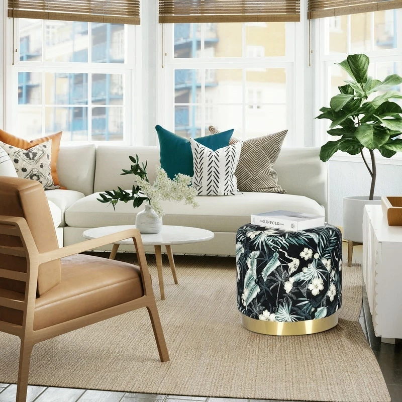 ใFASHIONABLE & FUNCTIONALใThe round shaped ottoman upholstered with a soft touching velvet fabric, padded with high quality foam and an attractive gold-finish base add an elegant accent to your home dรฉcor.ย