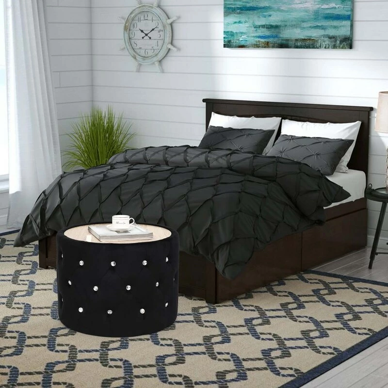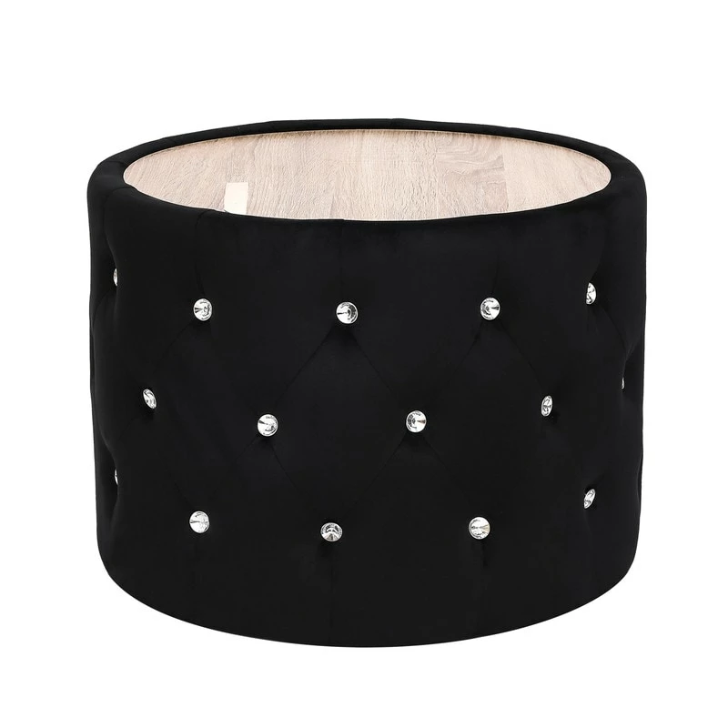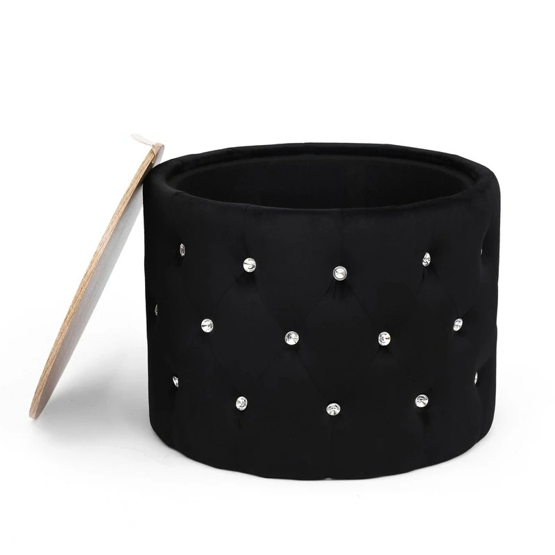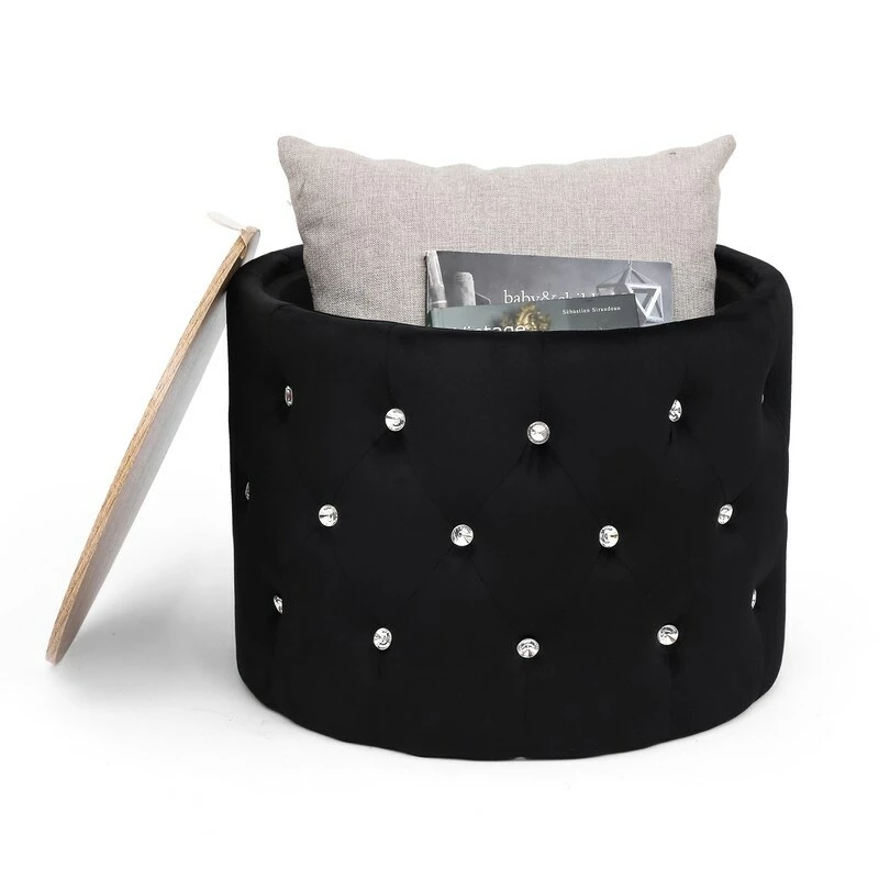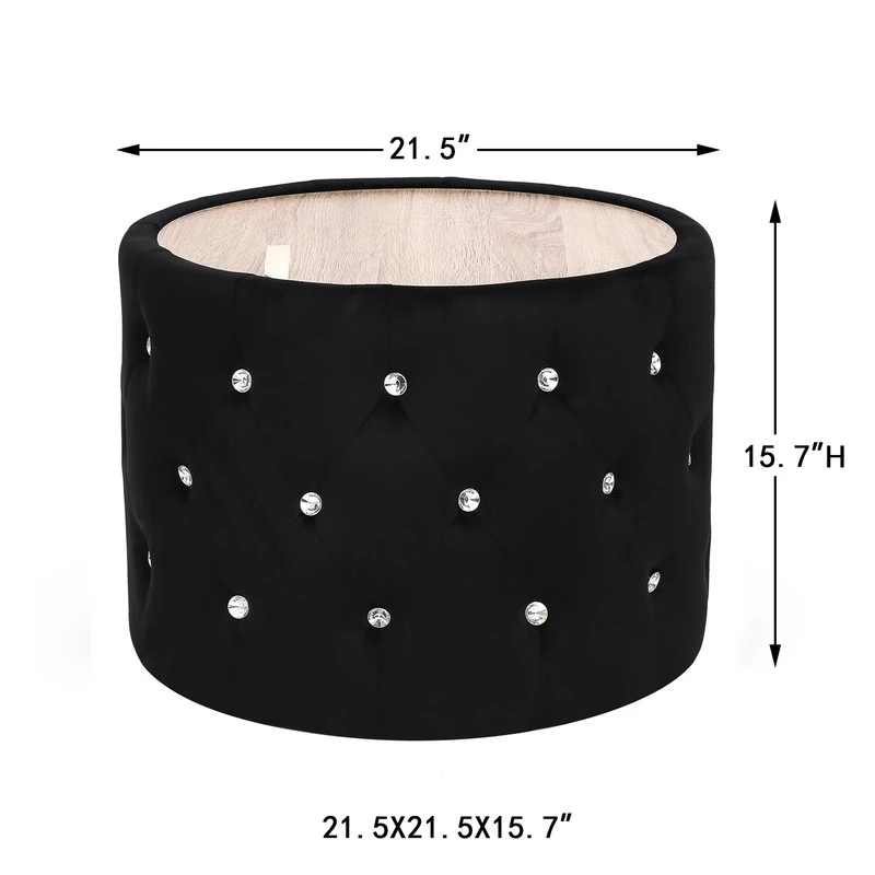Powerful Functions: It’s a footstool, a storage space, an end table, an extra seat for company, and a tray for snacks! An ottoman couldn’t be more clever and multi-tasking than thisDimensions: Choose an accessory that is the perfect size for you and your furniture. This round ottoman coffee table is 21.5″ W x 21.5″ D x 15.7″ H. You will love how much your space can transform with the simple addition of this charming ottomanDecent Design:This tufted, glam, velvet ottoman is the perfect addition to any living room. The luxurious black velvet is inlaid with glittering acrylic beads, and combined with a wooden top making this footstool look even more noble and elegantExtra Storage Space: This storage ottoman is sufficient to meet various need. Internal storage size is:17.7″x17.7″x15.9″. It can allow you to organize your small household items, store extra pillows or blankets in your bedroom or living room