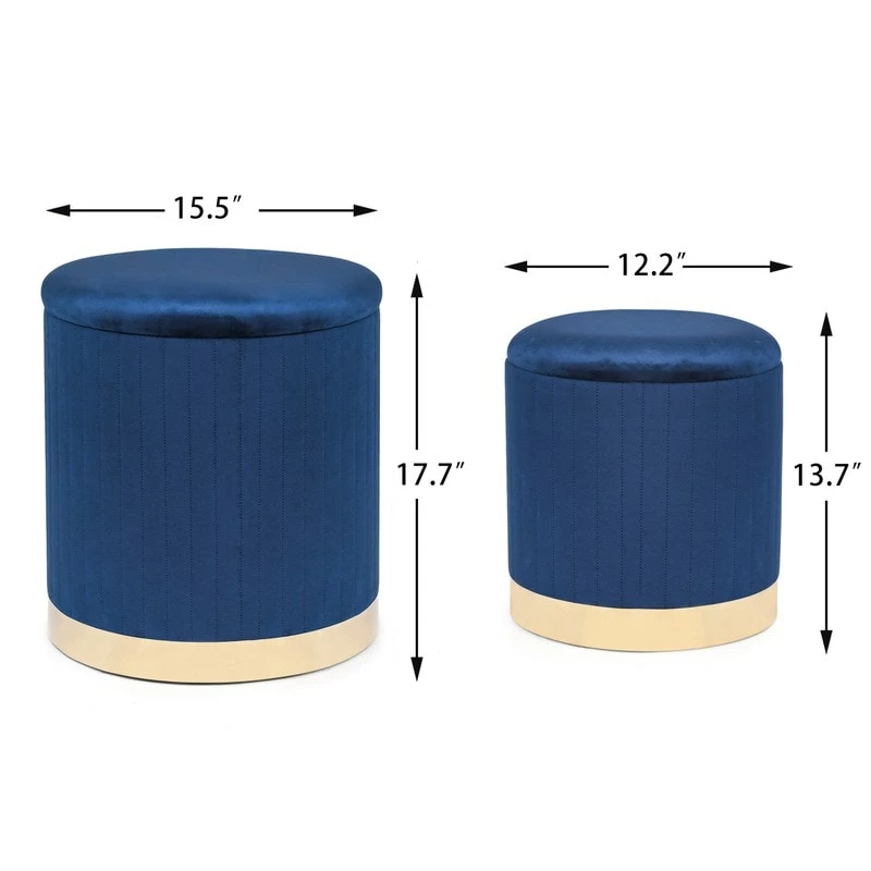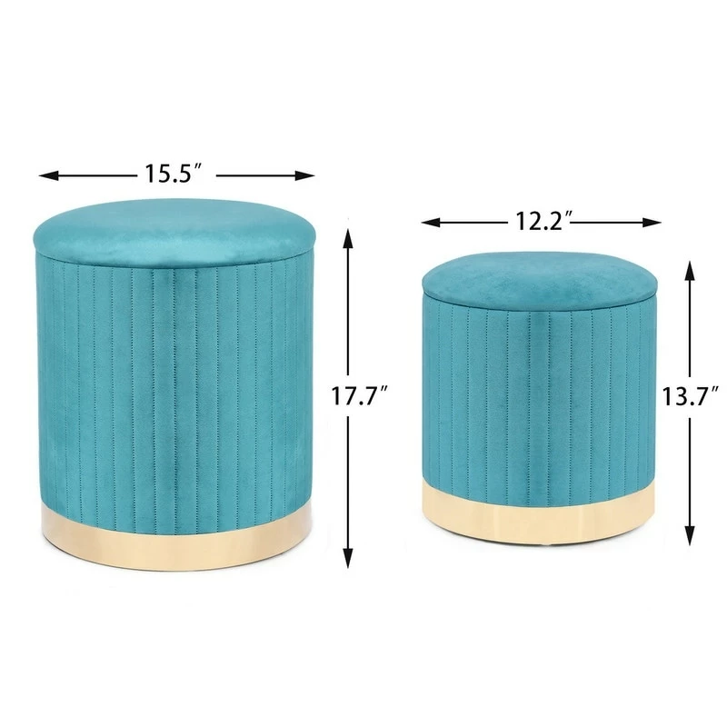 ใPerfect SIZE:ใ15.5″L x 15.5″W x 17.7″H (L) 12.2″L x 12.2″W x 13.7″H (S) .Good fit under your desk.You can put the small one into the big one .It is very suitable for space saving when not in use.ใCOMFORTABLE MATERIALใDesigned with luxurious and comfortable velvet fabric, filled with high density sponge making this ottoman very comfortable for sitting.ใLARGE STORAGE COMPARTMENTใPerfect round storage ottoman allows you to organize your small household items, store extra pillows or blankets in your bedroom or family room.ใMODERN DESIGNใGold Plating Base make this ottoman more Sturdy.Designed for long and lasting use.Four Anti slip rubber pad under the base will Protect your ground from scratches.ใMULTI-FUNCTIONAL OTTOMANใGreat for bed room, foyer and lobby wherever needs seating and storage.The ottoman could act as a coffee tabletop accompanying you at night or entertain your guest by providing extra Seat.