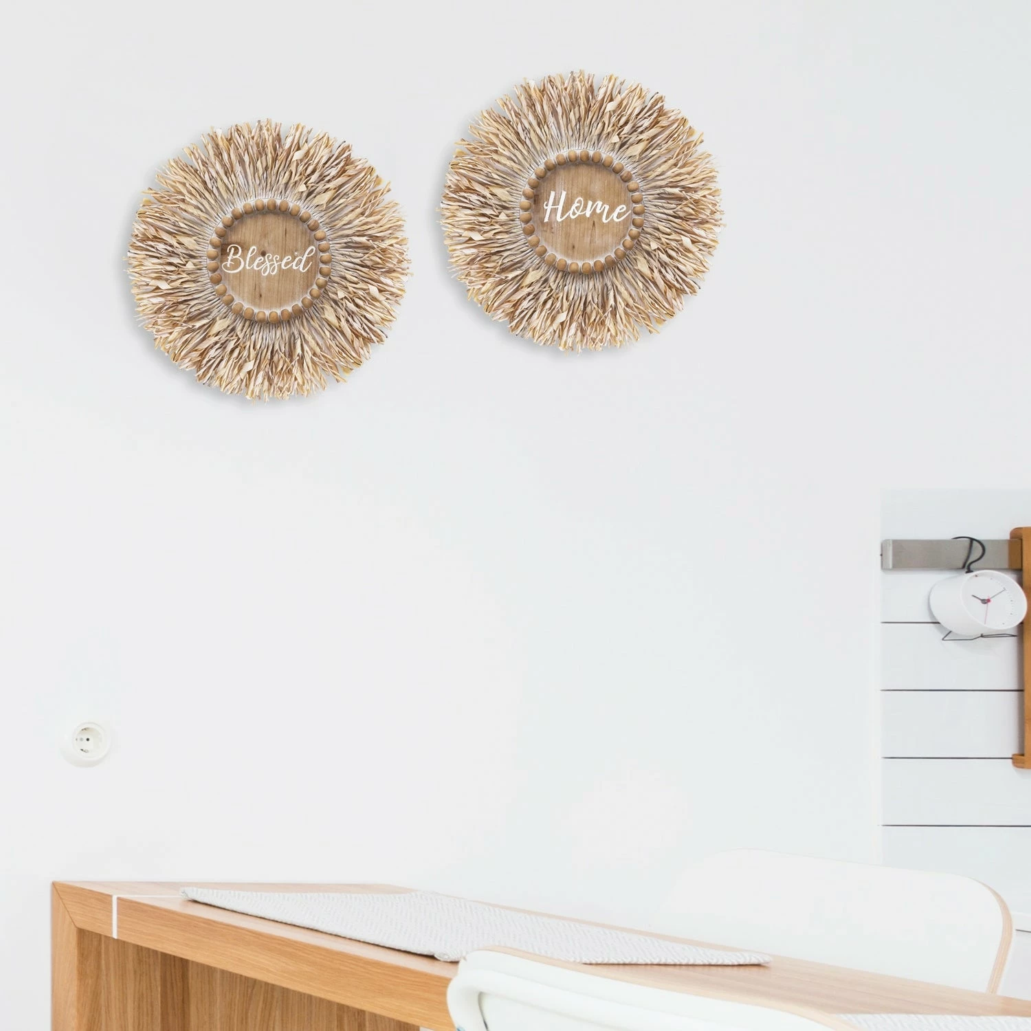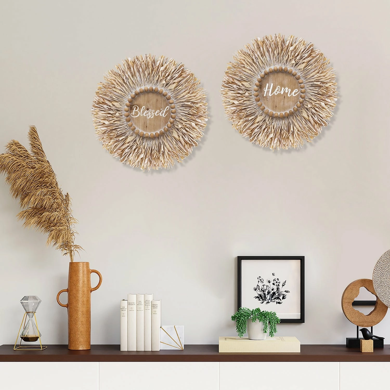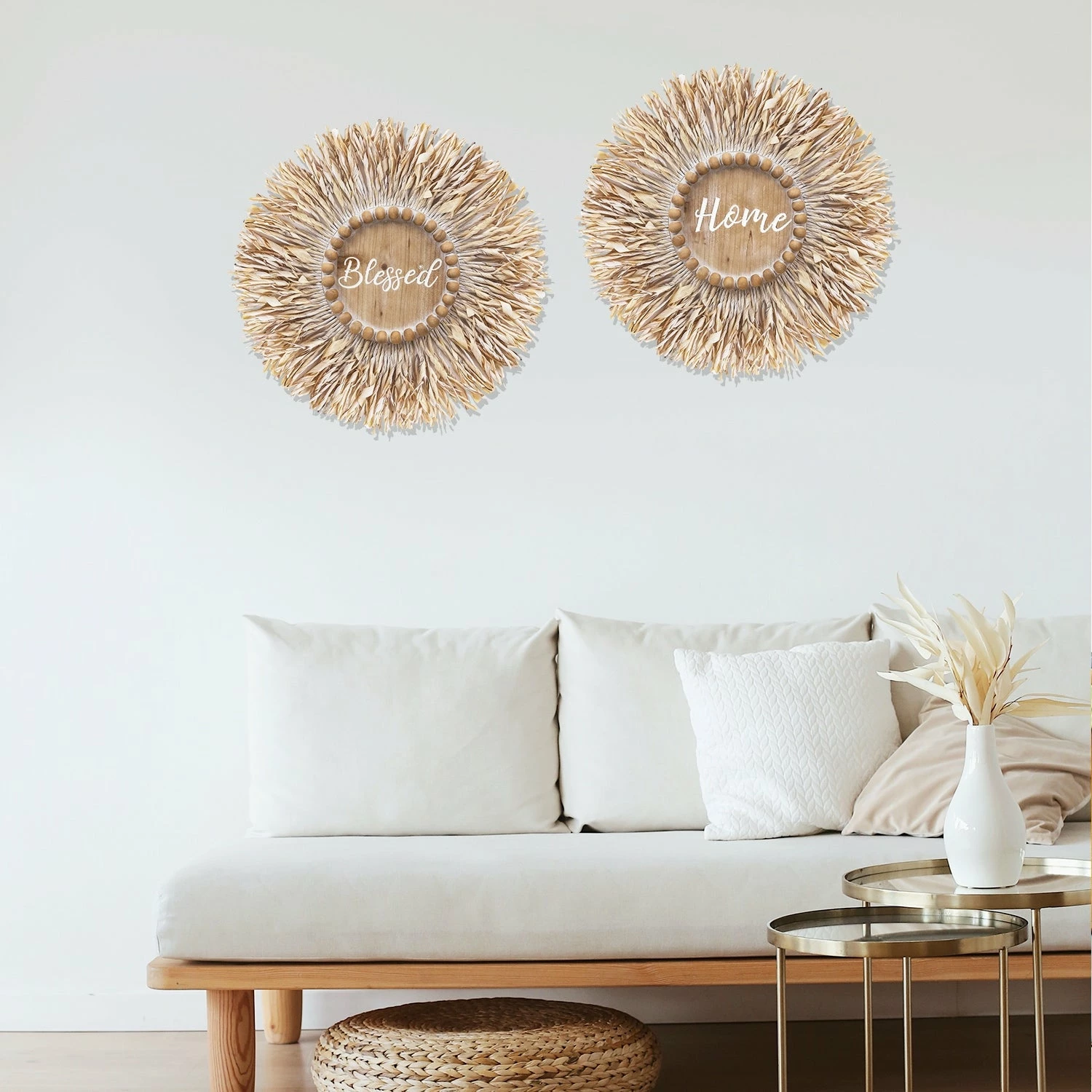 - Rustic Wall Decor for Living Room – This decorative wall art piece made of MDF With Fir Wood Veneer and Raffia. The beautiful wood texture and Home Blessed signs makes it an unique accent for your home.ย