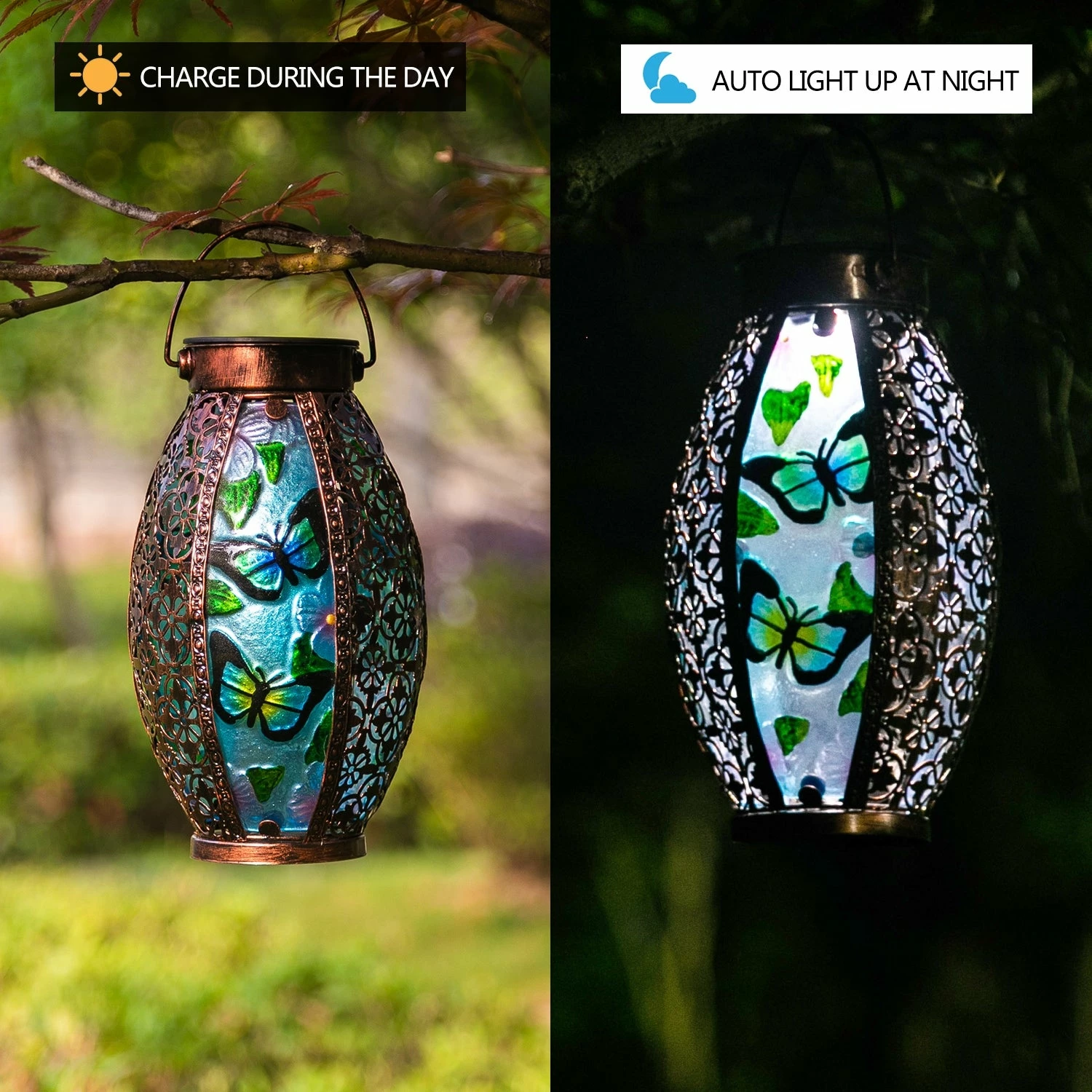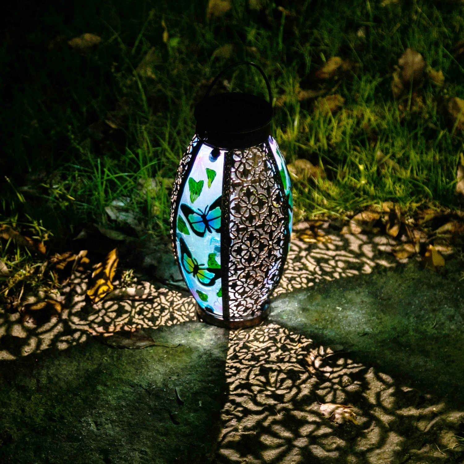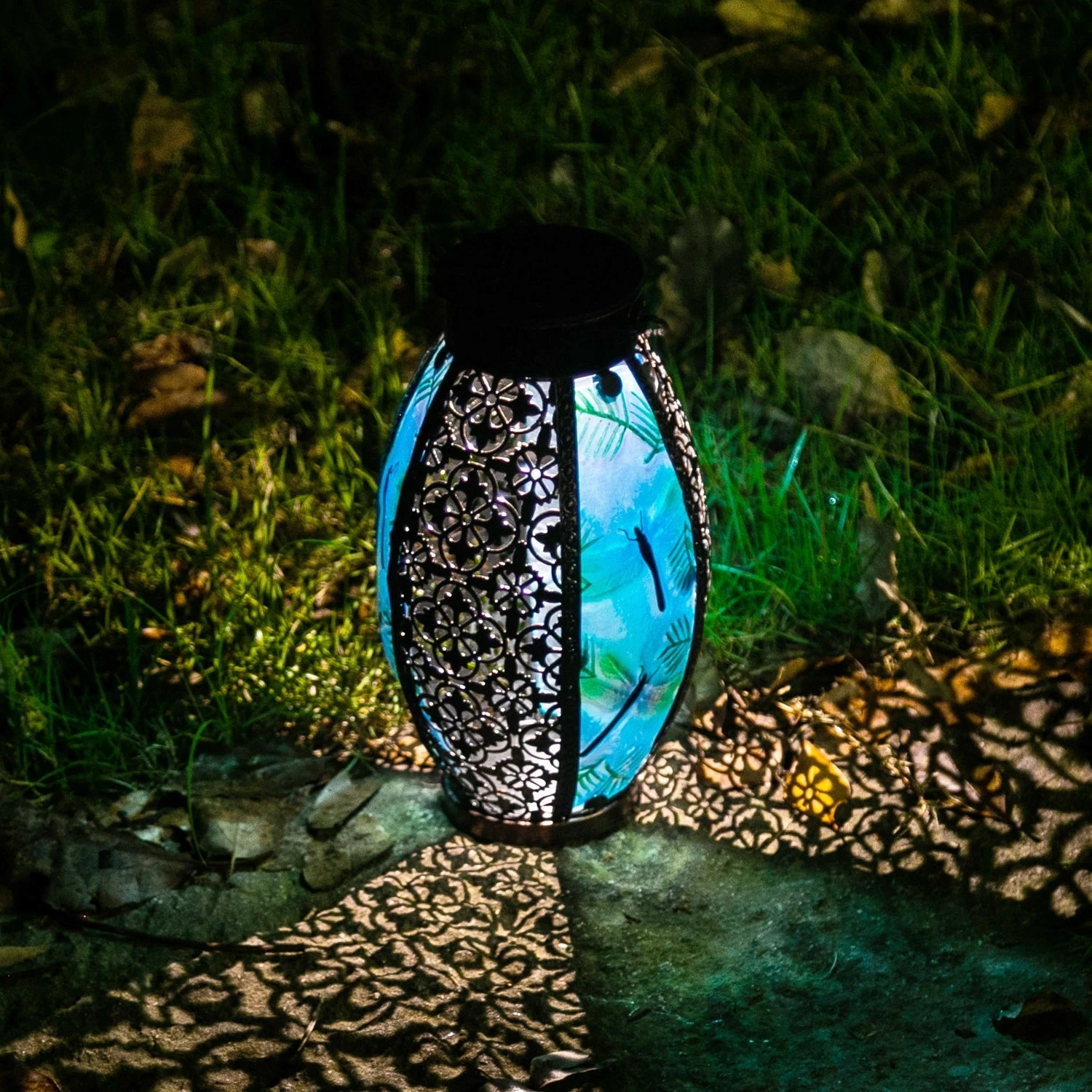 - 【NOVEL DESIGN】The solar lantern designed with beautiful blue dragonfly and hollowed-out pattern, retro classic style,the warm light will cast a beautiful pattern on the wall or table top, adds charm to your garden.