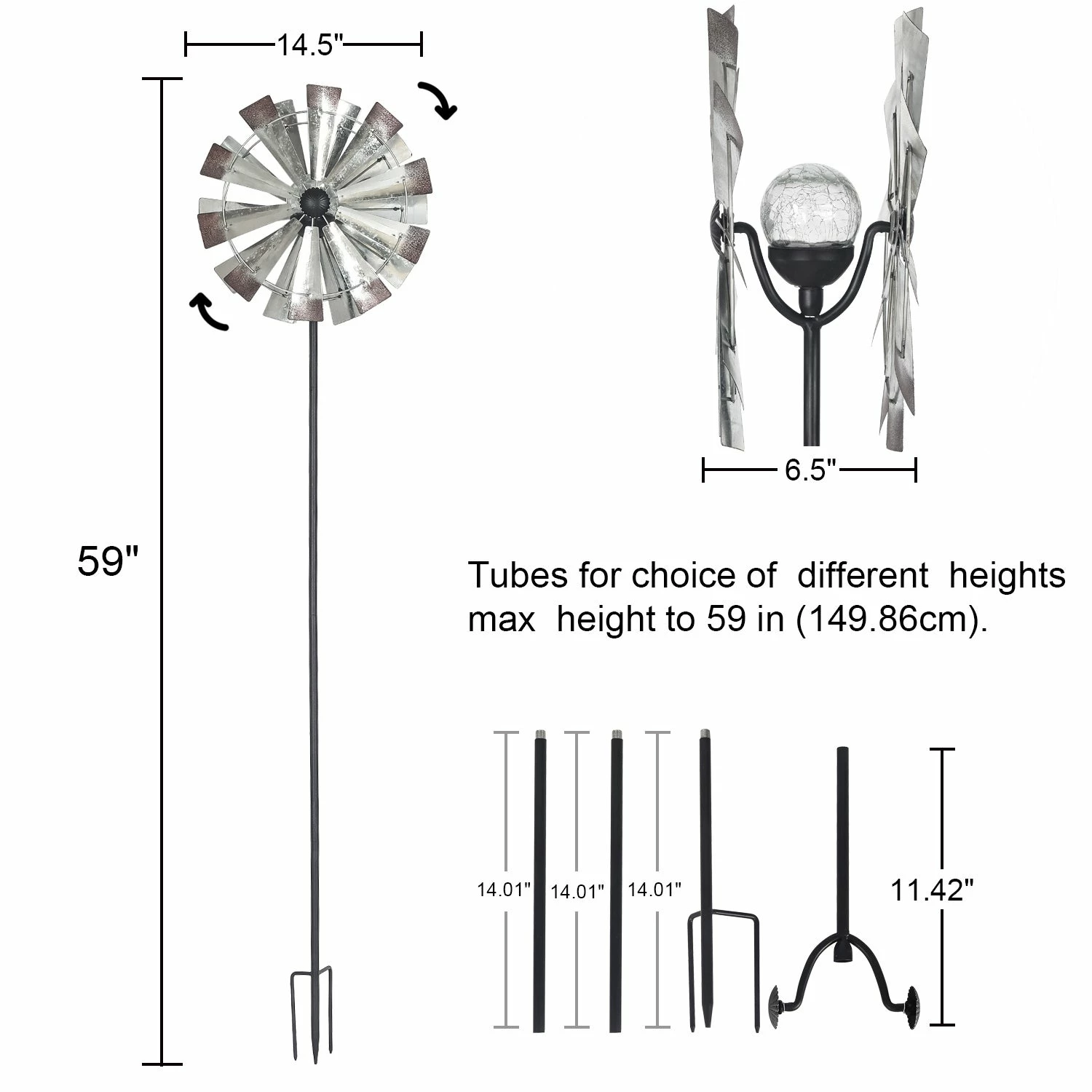- Unique Design: Adopting dual direction 360 degree rotating spinning wind blades with crackle glass ball, the 2-tier blades smoothly rotate in opposite directions even at low wind speeds. The tube can be adjusted to different heights up to 59 inches, you can adjust it according to your needs. Built in solar panel without any wires, it can convert sunlight into electricity during the day, and light up beautiful lights at night automatically.