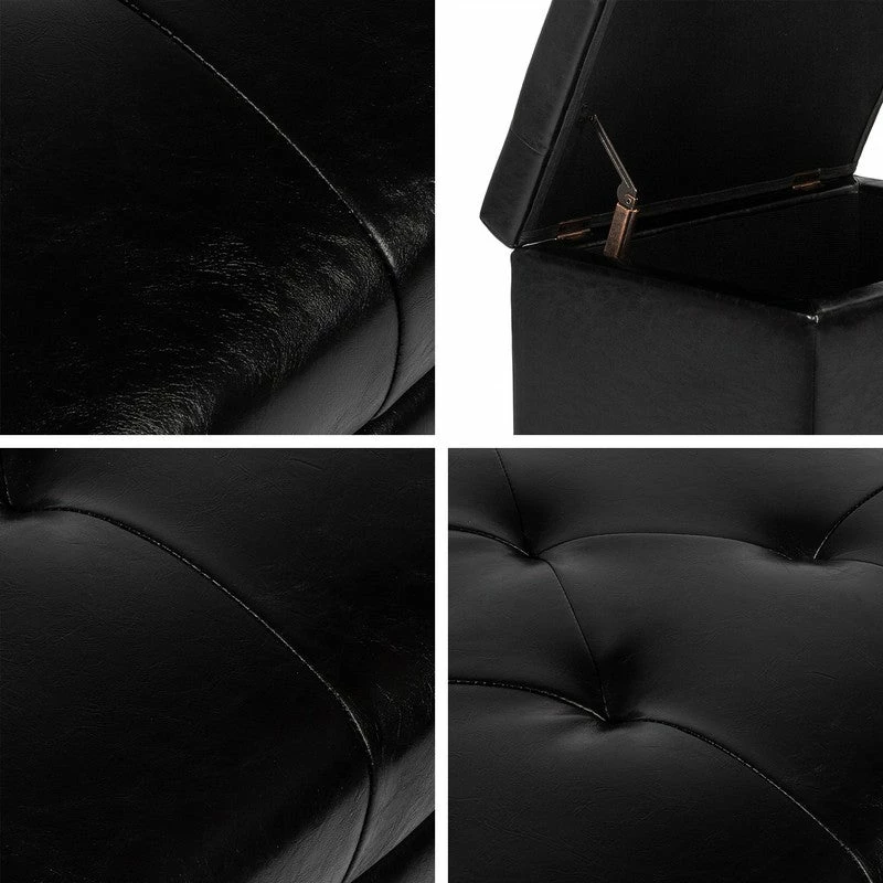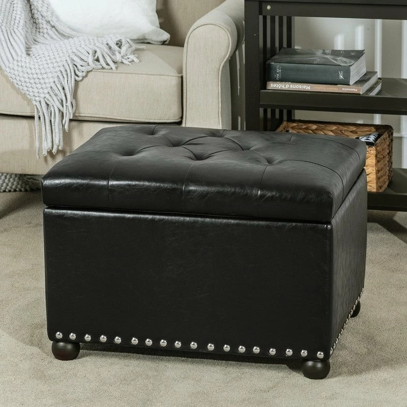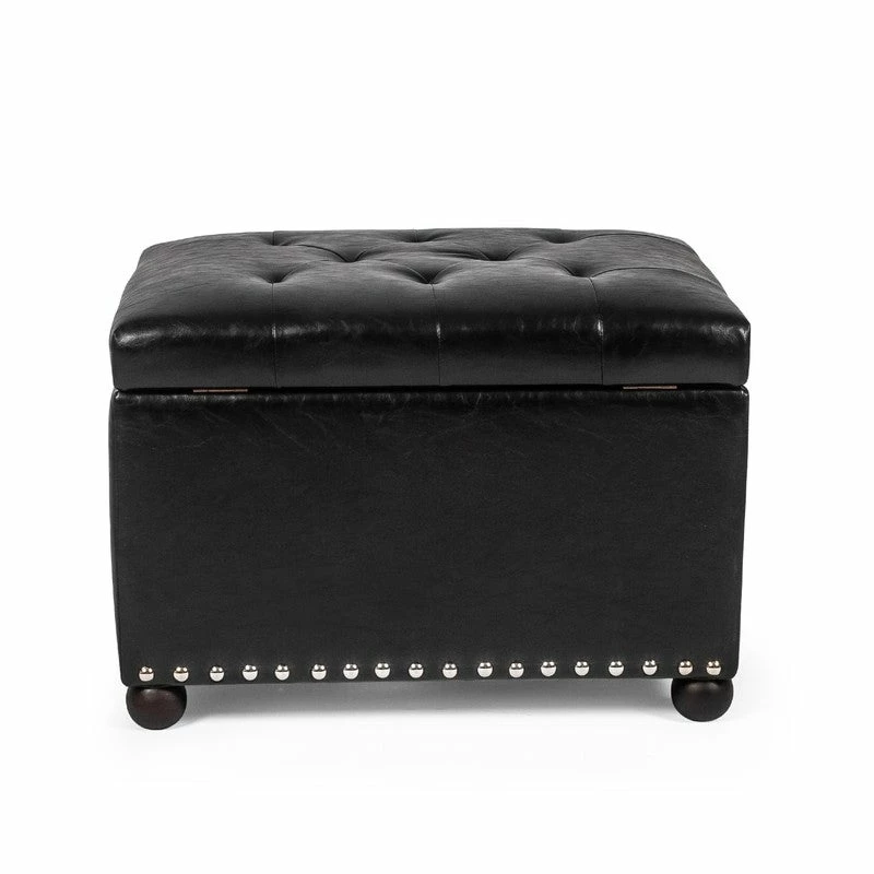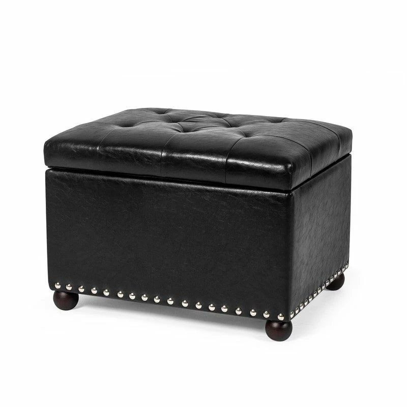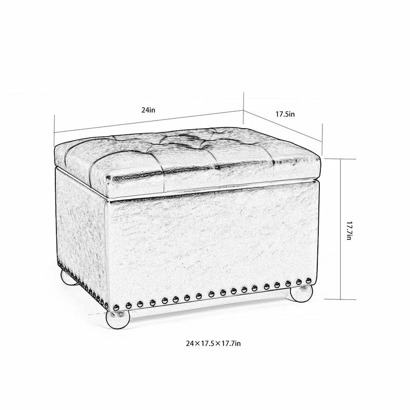 -Material: Button tufting bonded Faux Leather | solid wood-Dimensions: Overall: 24.21″L x 17.5″W x 17.71″H ; interior size: 21″l L x 14 5″W x 12 5″H-Quality: cushioned Top and cover provide softness and comfort, embedded solid wood offers stability and durability-Features a traditional, classy design; dark hue adds extra stain resistance; spacious storage space-Great for bed room, foyer and lobby wherever needs seating and storage, Also blends well with a variety of Décor