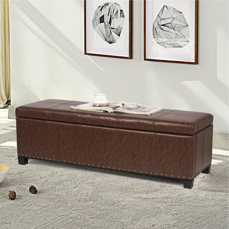 FIRM & SECURITY: Sturdy construction with a hard wood frame, plastic legs, faux leather upholstery. The inside of this storage ottoman is connected by safety pressure hinges and sturdy hardware accessories. They can keep the lid always open to prevent the bench from closing suddenly, or they can gently and slowly fall when you want to close the lid, so as to ensure that you are safer and more convenient.ย