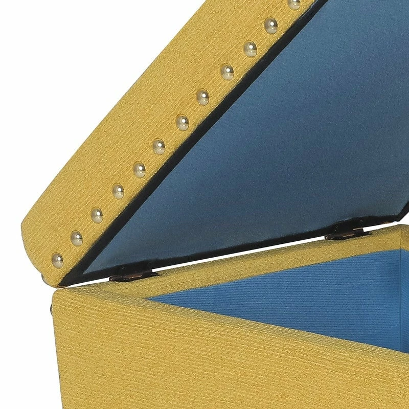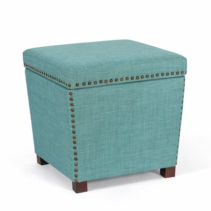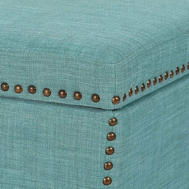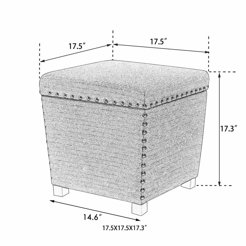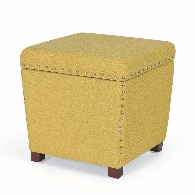 Decorate your home with this square shaped storage ottoman. This small footstool features trapezoid-shaped surface, nail-head trim along the edge for eye-catching elegance, accented with wood-finished legs. Lift-off lid keeps the ottoman open easily, which reveals a generous amount of room for storing various items.