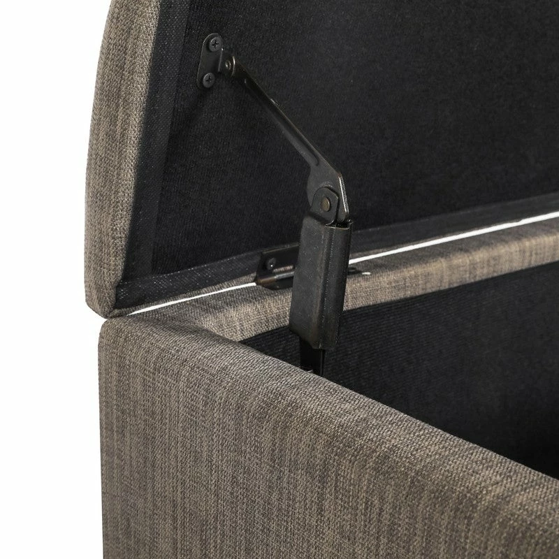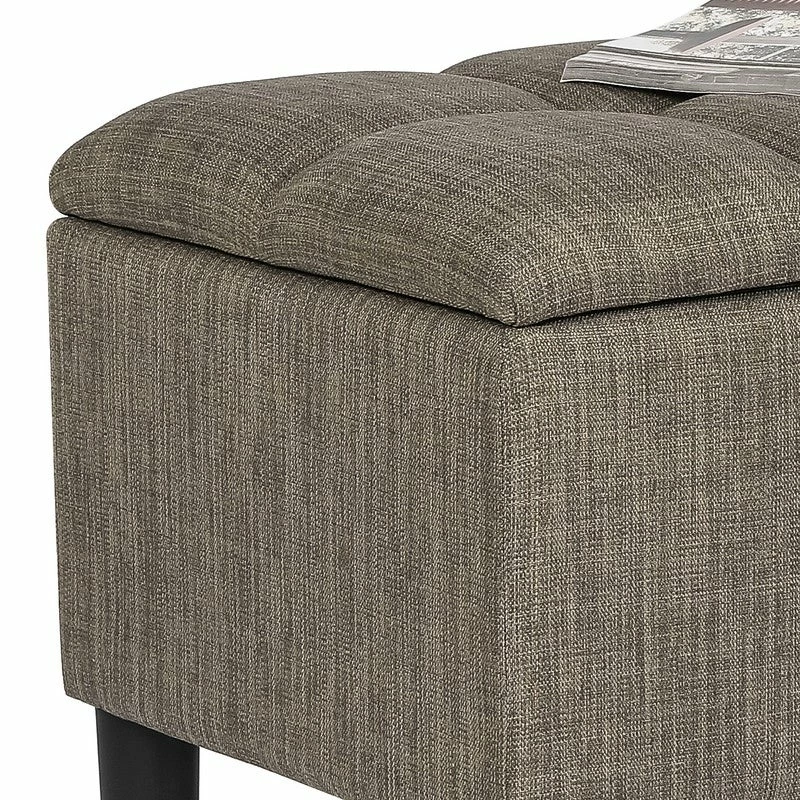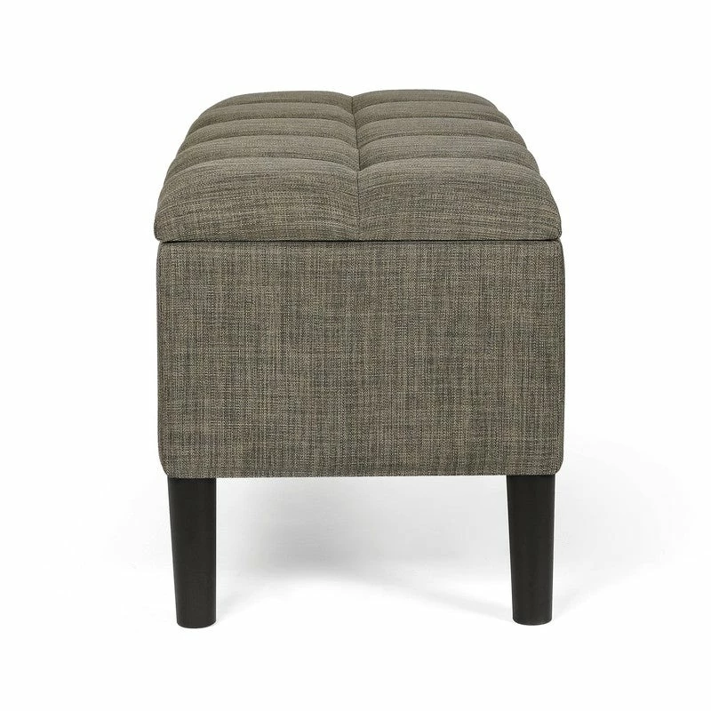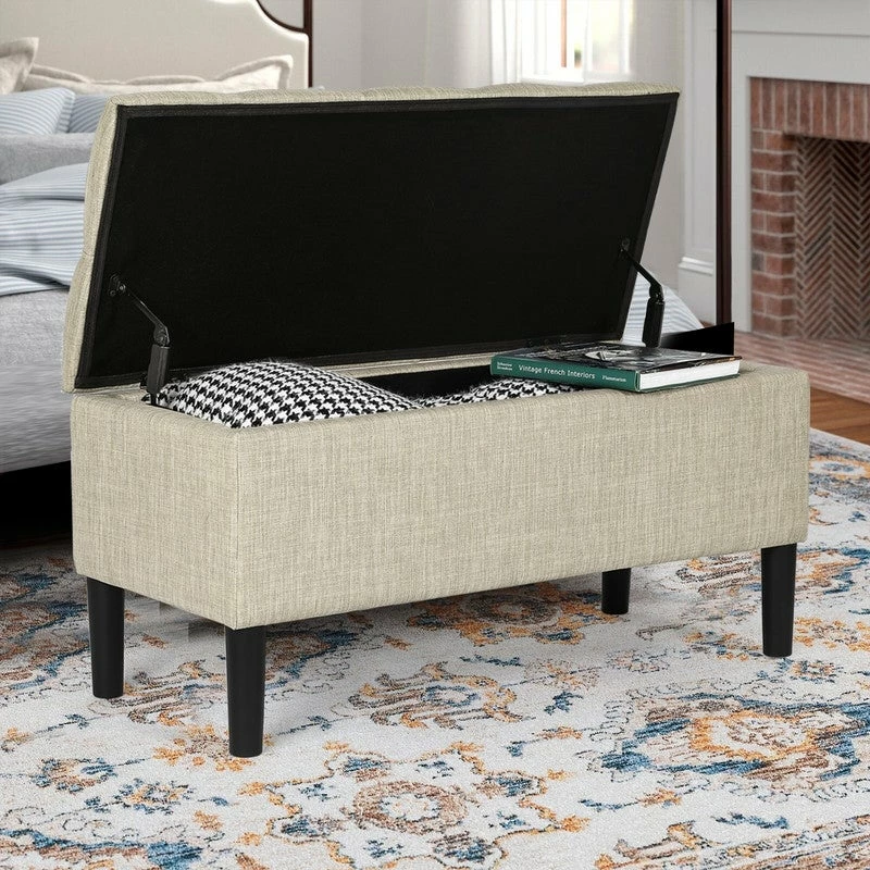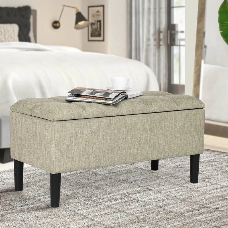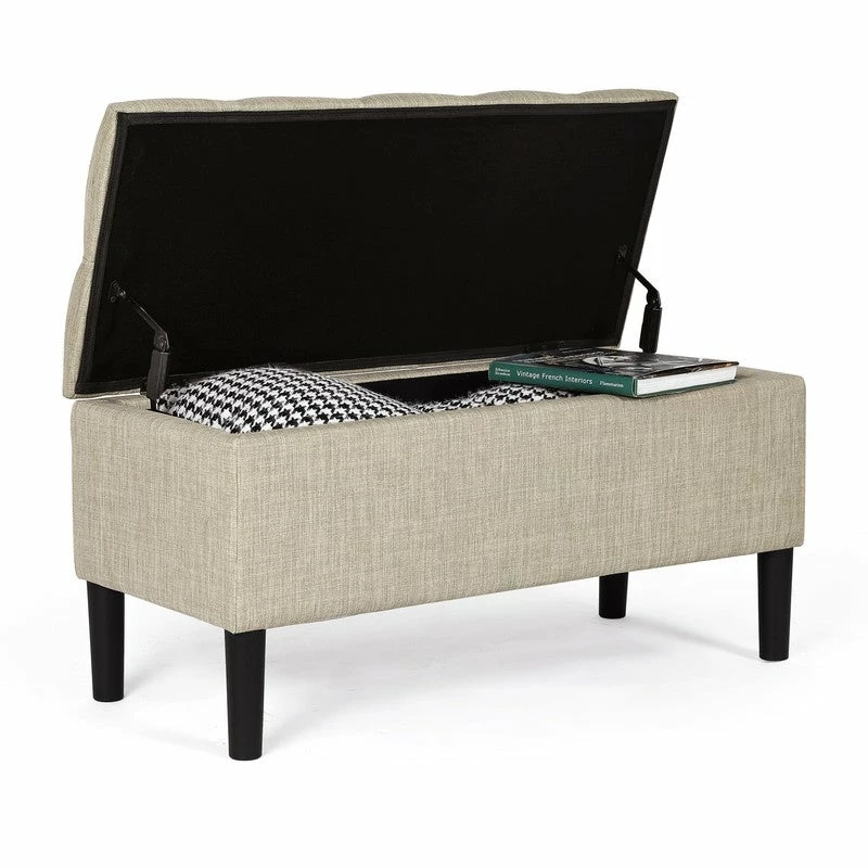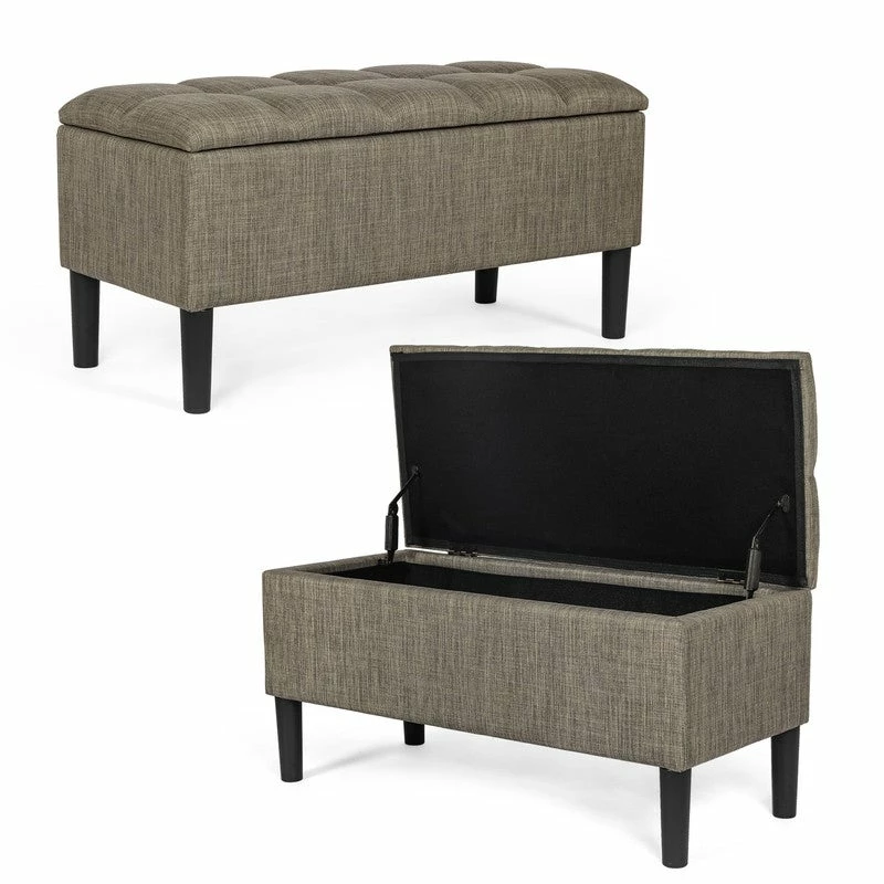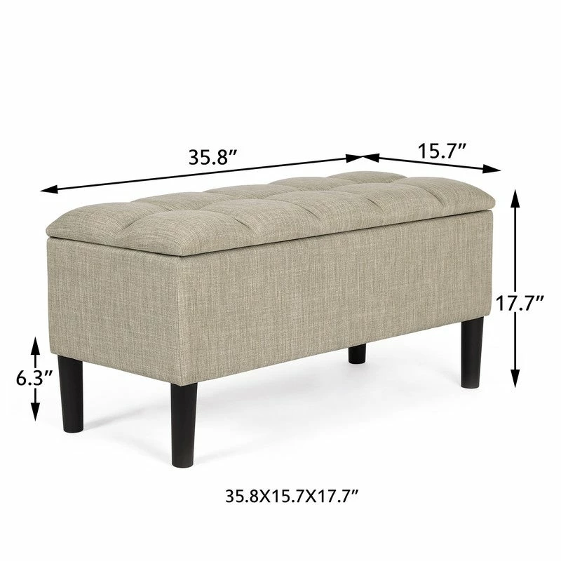 Overall Size: 35.8″(L) x 15.7″(W) x 17.7″(H). Interior Storage Size: 32.3″(L) x 12.2″(W) x 8.7″(H). Weight: 20.2lbMultipurpose: This bench is perfect for use as a seat or as an accent for any roomStorage Ottoman: Bench-style ottoman discreetly stores a variety of itemsModern Design: Mid-century modern storage ottomanComfortable: Sponge-padded, biscuit tufted top, soft and comfortable for sittingSturdy: Solid wooden frame for strong load bearing which can hold up to 300 poundsSafety Hinge: The safety hinge design allows the cover to stop at any angle to prevent it from slamming shut