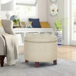 Best deal ๐ Adeco Round Linen Storage Ottoman Tufted Fabric Footstool With Lid Beige ๐